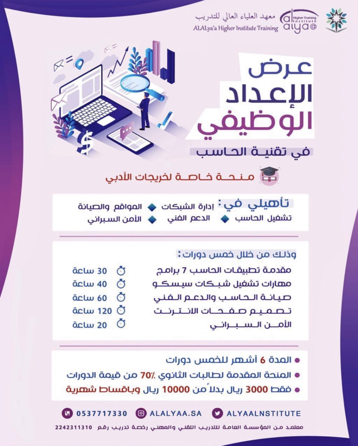 معهد العلياء العالي On Twitter منحة خاصة لخريجات الثانوي الأدبي دورات متقدمة في الحاسب الآلي فقط ٣٠ من قيمة الخمسة الدورات وباقساط شهرية موعد للفترة الصباحية من ٨ ١٠ وموعد للفترة المسائية من