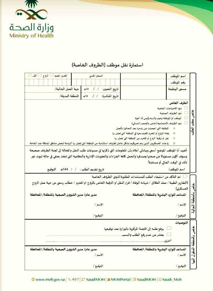 نموذج طلب موافقة على النقل حركة النقل لمنسوبي وزارة الصحة