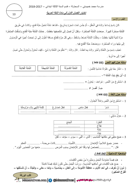 نماذج اختبارات مقترحة في اللغة العربية للسنة الثالثة ابتدائي الفصل الثاني 2016 2017