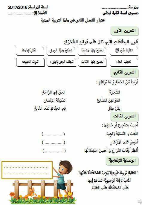نماذج اختبارات للسنة الثانية ابتدائي في التربية المدنية الفصل الثاني 2017 2018